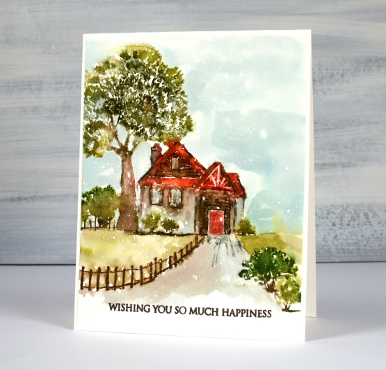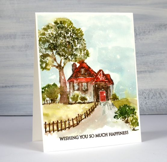 This is a very prettily watercoloured scene Heather with the pretty house, tree and bushes, and some wonderful added ink for the sky, grass and shading on the driveway, and with the wide inked sentiment which draws you beautifully into the scene. x