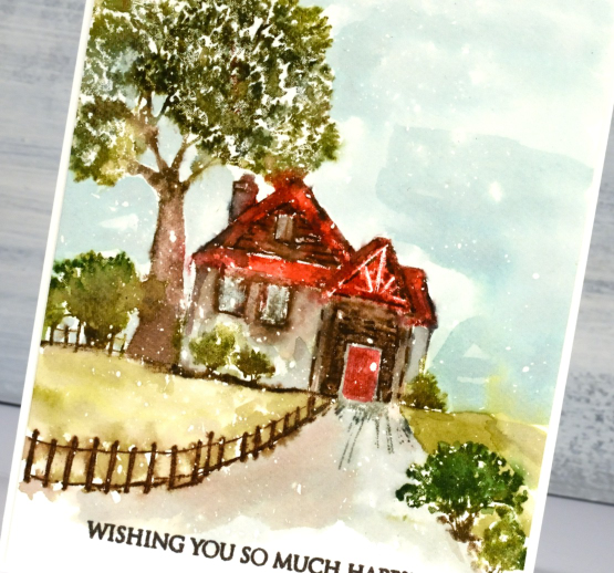 I stamped first in antique linen so I could see the whole scene as I added colour bit by bit to the cottage, fence and trees. I used a mix of distress ink pads and markers. To blend the inks I sometimes spritz the stamp before stamping so the inks start moving or I use a paintbrush after stamping to move the inks to fill an area like the roof or walls of the cottage. If some details get lost in the blending I use a marker to add definition back to the scene eg. bricks, roof and chimney outlines.