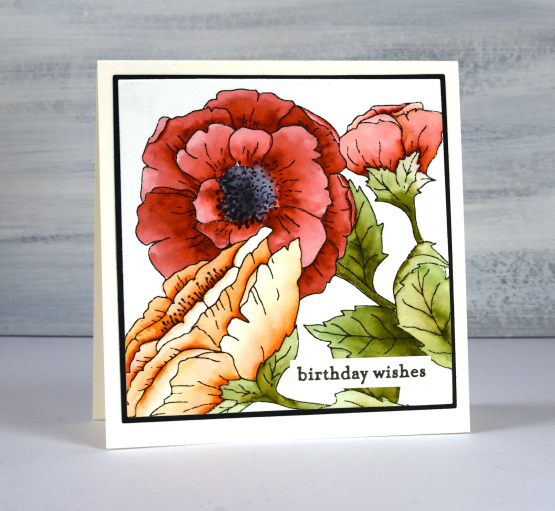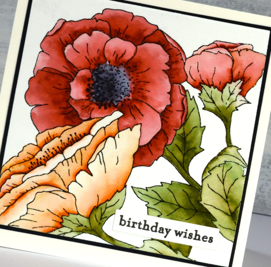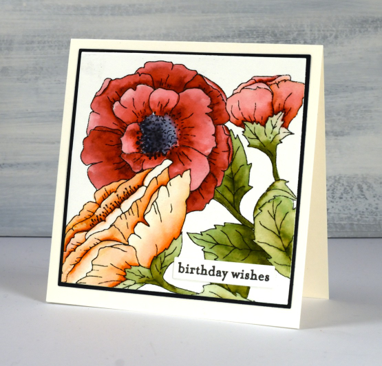 A bigger image fills the card front beautifully and is easier to colour. I enjoyed colouring this one while relaxing on the couch. I used zig clean color real brush pens which are highly pigmented. I was able to add intense colour to one side of the petals then blend it out with a waterbrush. It is easy to add a bit more ink if needed or add a different colour just by touching the tip of the brush pen to a wet area on the petal. The zig pens are easy to control and mine are lasting very well.