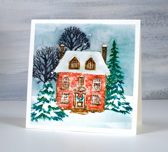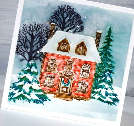 I continue to enjoy the gorgeous autumn colours outdoors these days but there will be a few wintry scenes appearing as I create cards for the coming months. This sweet house, a Penny Black stamp called ‘warm reception‘, is similar to several we see on our drive to church. They are lovely houses and look impressive during all the seasons including when they are surrounded by snow.