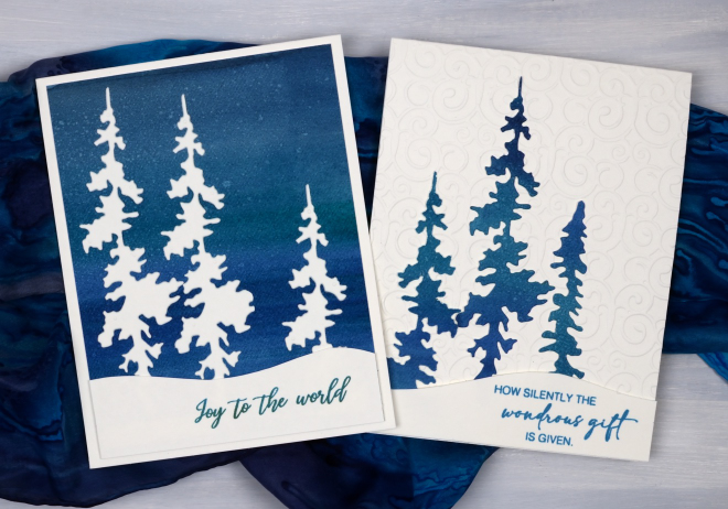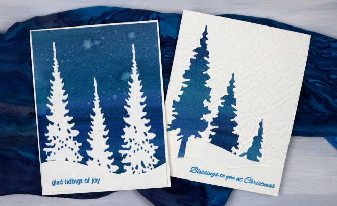 Here are a few more watercolour Christmas cards I made this year. I painted a large panel of watercolour paper in blues and greens blended together to create a striped mix of tones. From the large panel I cut background rectangles a bit smaller than my card bases and trees of different heights to arrange against embossed white skies. I don’t know the name of the tree die set as I borrowed it from a friend. I really like the non-symmetrical trees featured on the cards above.
