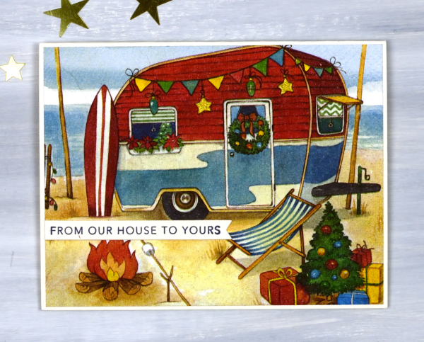 I would happily give credit to the artist responsible for today’s cute scene but the packaging from the German company IHR product does not included the designer’s name. Despite what you might think I didn’t buy these napkins when I was in Australia earlier this year, I bought them in a little town in Quebec. I was so surprised to see them in Wakefield, in summer, very far from places that might celebrate Christmas on the beach in a caravan with a surfboard handy!