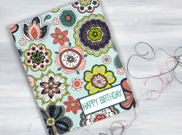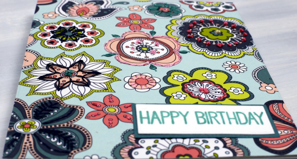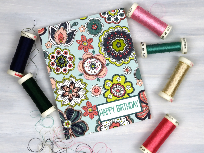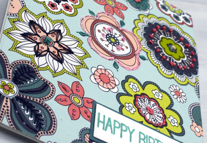 I used the patterns on the flowers as my guide for stitching. I didn’t stitch on every flower or on every part of a flower. I used French knots (some a bit rough!), daisy stitch and plenty of simple straight stitches covering lines on the patterned paper. The sentiment is from the MFT Birdie Brown greetings galore set.