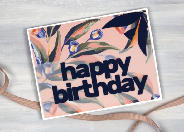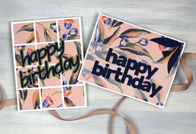 I’ve made a few more cards from the pages of the beautiful 2025 Earth Greetings calendar. I posted the cards made from the cover in a recent blog post. On the back of the cover was the January artwork by Jayne Branchflower featuring eucalyptus leaves and gum blossoms on a pink background.