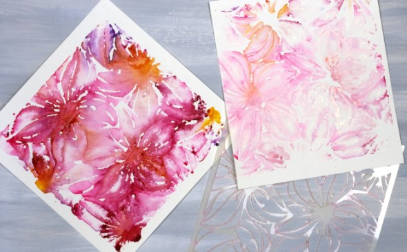 I’ve been creating quite a few patterned panels using stencils and watercolour while designing a workshop. There have been many experiments and most, but not all, have turned out quite well. You can see in the photo below the Creative Expressions square ‘Clematis Burst’ stencil beside two panels. The bright one on the left was the first impression and the one on the right the second impression using paint remaining on the stencil.