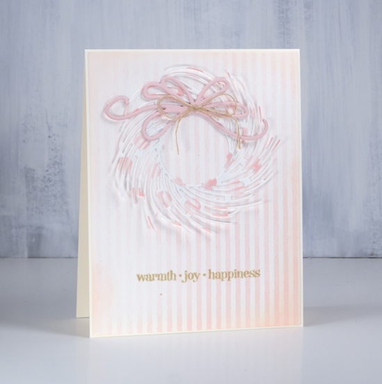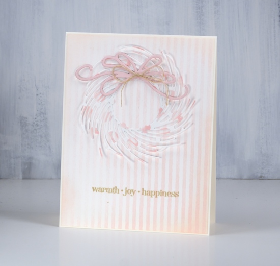 I chose the elegant ‘whirl wreath’ by Penny Black and cut one out of ‘pink dots’ cardstock. I attached it around the centre circle with adhesive but left the branches unattached ( so I will be careful putting it in a envelope) The background is ‘rose stripes’ which matches the pink dots perfectly. I cut the bow out of a piece of cardstock from my stash and layered a few together to give it some extra weight. I blended around the edge of the striped panel with tattered rose distress ink and attached everything to a cream cardbase.