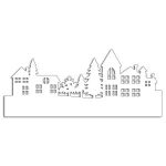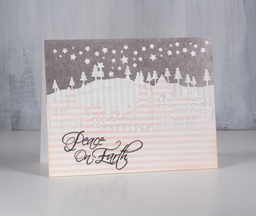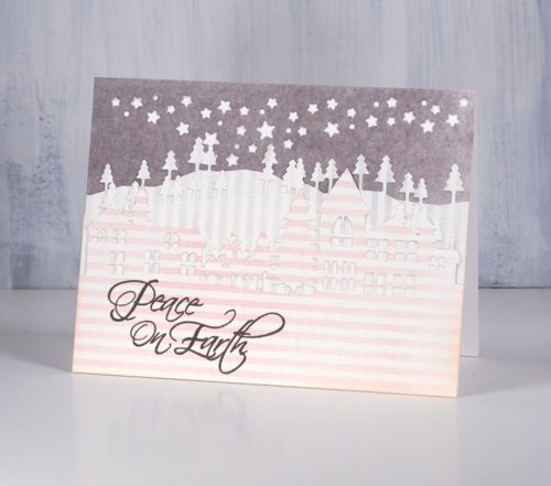I have been wanting to try a white on white layered die cut scene and I probably still will but chose to try it with these pretty papers first. The neighbourhood is layered over two layers of trees cut with the ‘trees and hills’ dies which are layered over a gray piece cut with the starry sky night die attached directly to a white card base.
