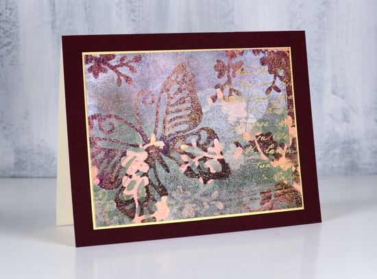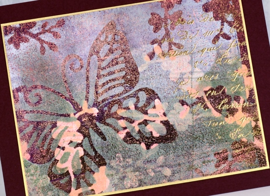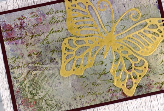 It’s always hard to capture shimmer on camera but all three panels have gold shimmer on them so I added some gold accents to each one. On the top panel I stamped the PB script stamp, embossed in gold powder and matted the panel with gold cardstock. On the card above I added a gold embossed sentiment from the PB set happy snippets and stamped the same script stamp in chianti versafine clair. On the card below I stamped the script stamp in shady lane versafine clair ink and added a gold vellum die cut butterfly, the same butterfly used as a mask in the gel printing process.