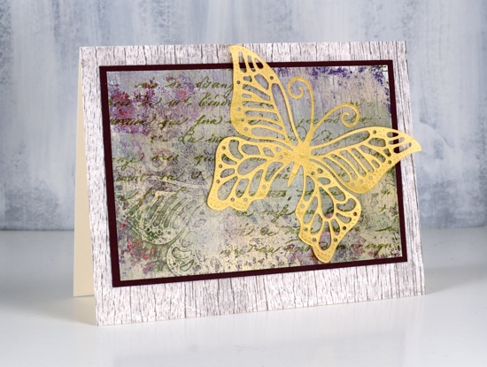 You can see the woodgrain print through the paint and pattern. I ended up matting both panels in burgandy cardstock then attaching them to a base panel of the same AR woodgrain paper.