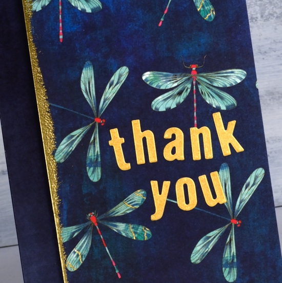 I did add a few of my own touches to the cards in the end but I might still make dragonfly paper card fronts which are simple and unadorned. Because of the little bits of gold here and there on the dragonfly wings I chose gold cardstock and embossing powder for my added elements. I swiped a versamark along edges of the dragonfly panels then embossed them with gold powder.