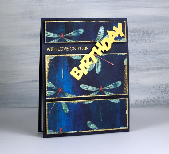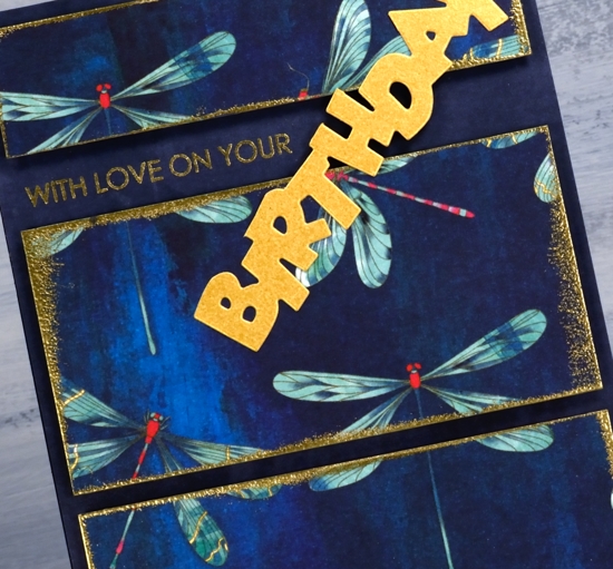 I used a co-ordinating Alexandra Renke paper on both card fronts. It’s called ‘autumn wild dark blue’ and it looks like a painted page. I popped up the dragonfly pieces on foam and added a gold embossed sentiment plus letters or words die cut from gold shimmer cardstock. I used the PB …birthday die paired with part of a sentiment from PB ‘good wishes’ set. I did all the lining up of panels with the help of the Wendy Vecchi art staytion. The board is metallic and has a magnetic ruler which can hold a panel in place while lined up with the grid lines on the board. It has saved me quite a bit of time and fidddling!