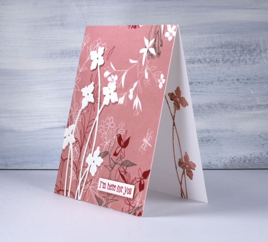 For both cards I covered the whole front with AR ‘Autumn Plant Rose’ paper. The delicate floral design covers most of the paper so I didn’t want to add too much that would clash with the paper. I chose instead to die-cut cream flowers and birds as focal images, keeping them cream coloured and stacked made them stand out from the background pattern. The tall flower die is from Penny Black and is called ‘shall we dance’. I like the way the long thin stems mimic the thin lines of the paper’s design.