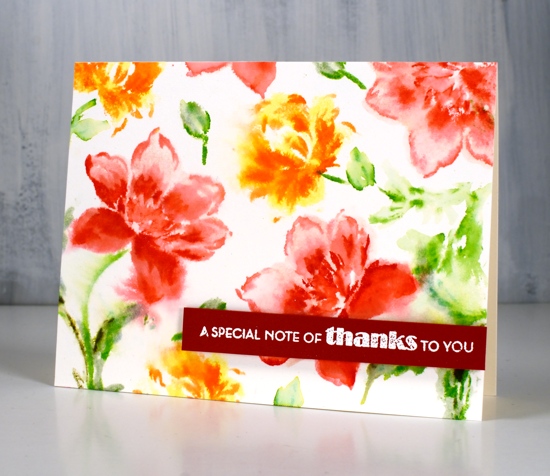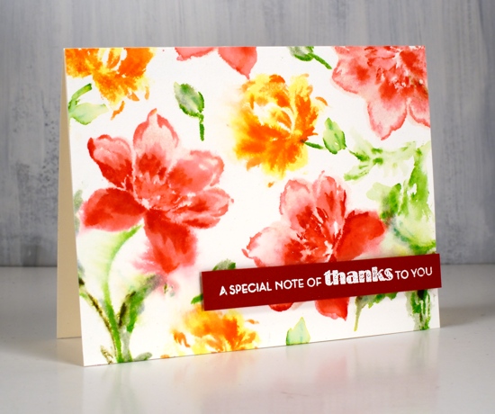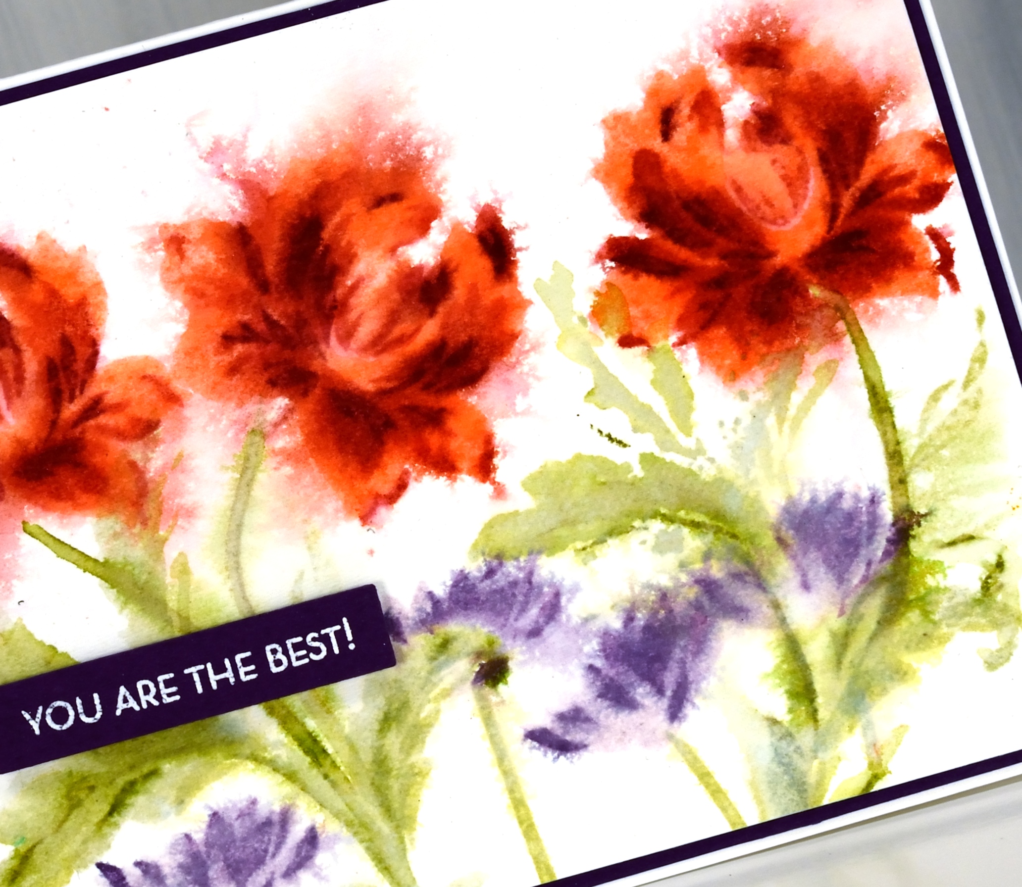 The second panel was stamped with less spritzing during the stamping process, just a little in fact on layer number two. Instead I waited until all the stamping was done and spritzed in one direction to make the petals feather out then the other direction to balance things. This time I used abandoned coral, fired brick and aged mahogany inks for the roses, milled lavender and dusty concord for the little flowers and old paper, shabby shutters and peeled paint for the leaves. Even though it looks like black, I matted the panel with purple cardstock and added an embossed sentiment also on purple and cut it out with the Avery Elle sentiment dies that are making me neat and happy right now.