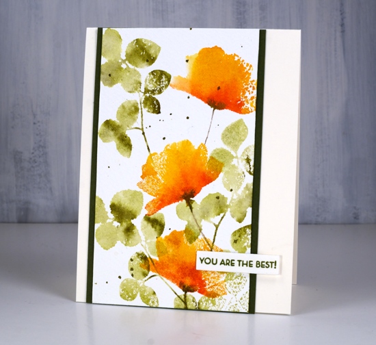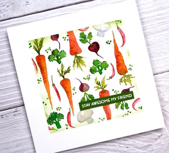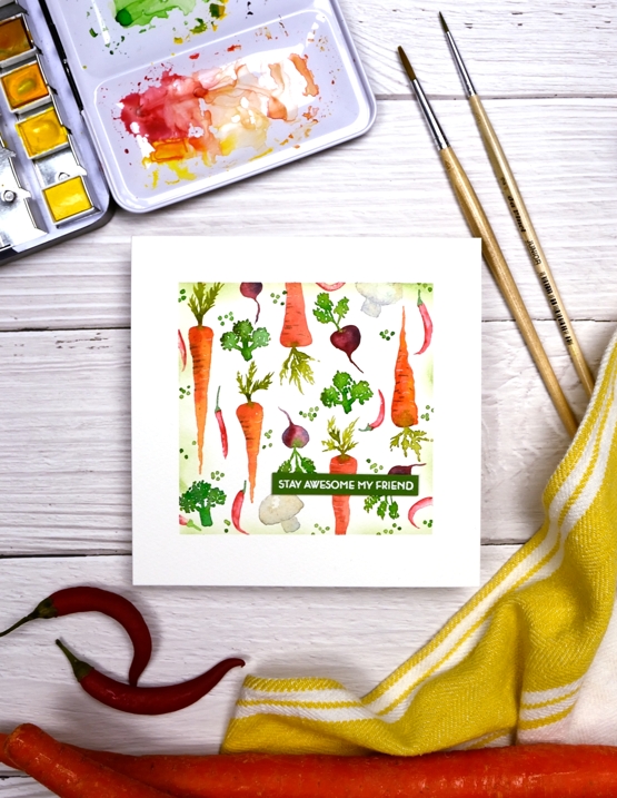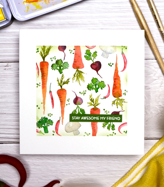 When I had filled the panel with carrots, broccoli, beets, chiles and mushrooms it still looked unfinished so I had to include the peas. I am not a fan of peas but as you can see they are the perfect filler, for a painting mind you, not a meal. When I was a child I was required to eat the number of peas that matched my age at the time and yes my family still brings that up and amuses themselves by asking if the required number of peas are on my plate! After I’d added the peas, with a stylus not a paintbrush, I still needed more definition on the masked edges so I blended some bamboo branch memento ink lightly over the tape. The sentiment is from Altenew’s ‘leaf canopy’ set.
