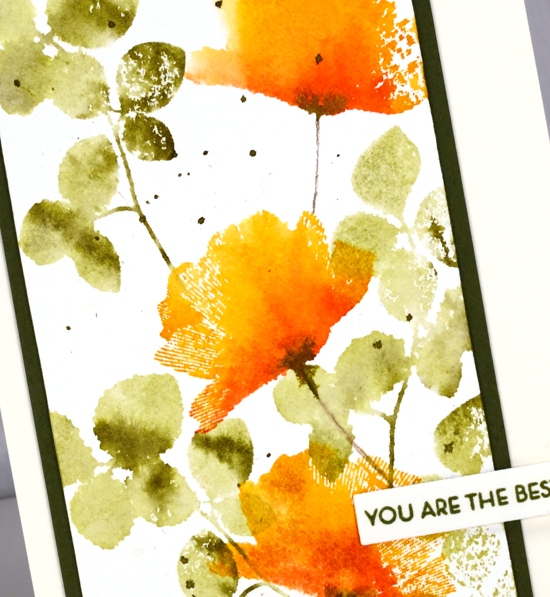 The leaves I did in a similar manner with bundled sage, mowed lawn and forest moss. The sentiment from Altenew’s Leaf Canopy set is embossed in white on a red cardstock strip and popped up on dimensional foam tape.