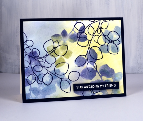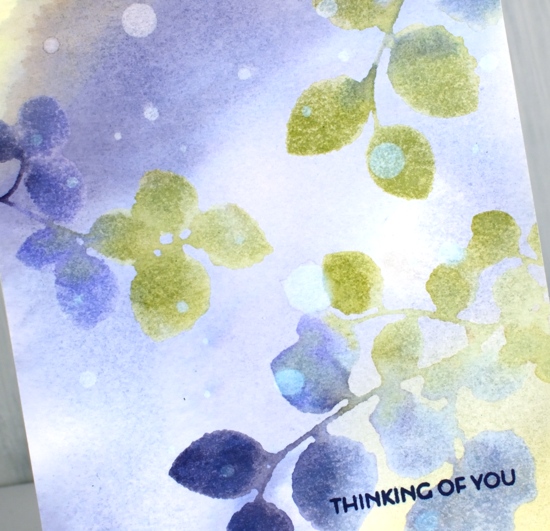 For my second card I switched one ink colour, instead of stormy sky I used shaded lilac so there are more purple tones in this one. I made the background the same way and did the stamping the same way but then took a bit of time adding water droplets strategically not in a splattery way. I wanted them to look random so I took care to place each one with a drop on the end of a paintbrush! I let them sit then absorbed the water with a paper towel leaving a pale circular watermark on the panel.