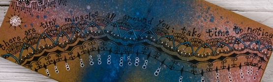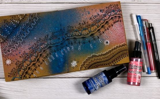 I began with a few strips of Ciao Bella rice paper glued to the left and right edges of the the journal pages. Over the rice paper I added texture paste through the Tim Holtz ‘clockwork’ stencil then filled the rest of the background with brown and black distress inks and sprays.
