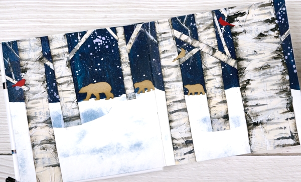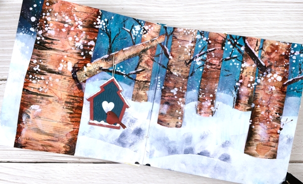 The stencil exposes only the edges of the birch trees which I wanted to be black so I mixed some black gesso with some black texture paste to make it thicker then spread it through the stencil onto the painted pages. Once it dried I painted the white spaces first with white gesso but it wasn’t opaque enough so I used Dr Ph Martin’s Bleedproof white paint.