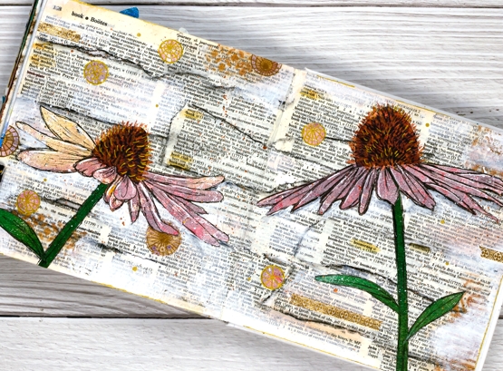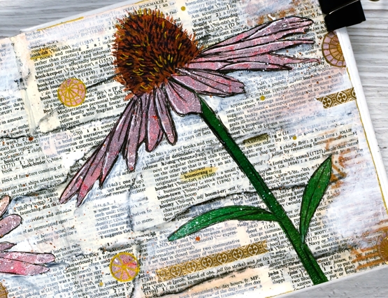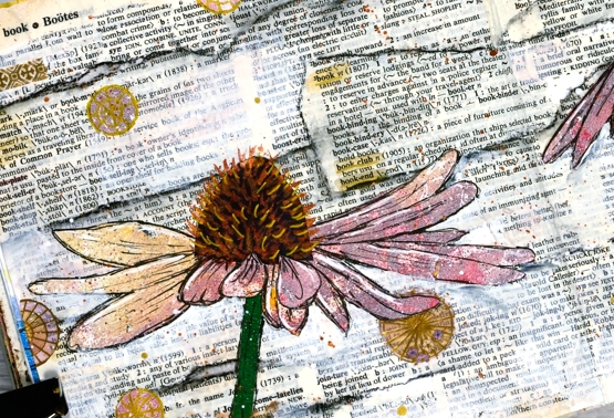 I have echinacea or cone flowers growing happily in my garden and now happily in my almost finished 6″x 6″ art journal. A friend recently gave me a great big dictionary for cutting up so I ripped out the ‘book’ page and the ‘journal’ page and used them to cover the whole double page spread before I did anything else.