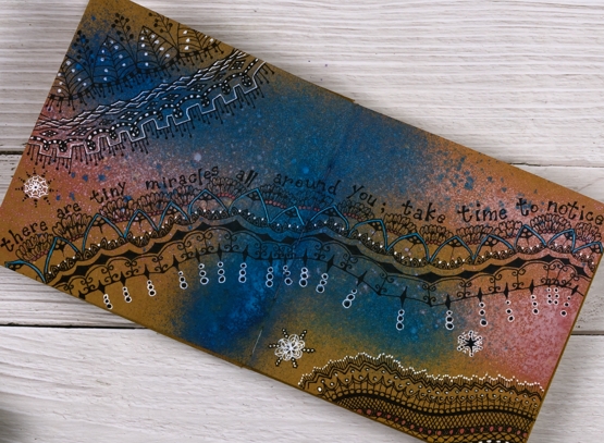 So far I have tried distress sprays, gel pens, acrylic paints and texture paste on the kraft pages. As long as I include some light colours in my designs the brown background words really well. Next experiment? Collage, stamping or maybe coloured pencils.
