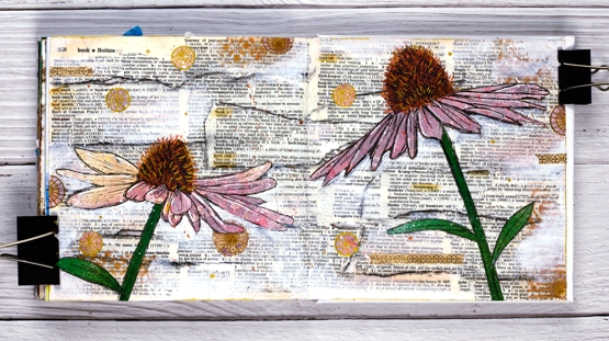 I have echinacea or cone flowers growing happily in my garden and now happily in my almost finished 6″x 6″ art journal. A friend recently gave me a great big dictionary for cutting up so I ripped out the ‘book’ page and the ‘journal’ page and used them to cover the whole double page spread before I did anything else.