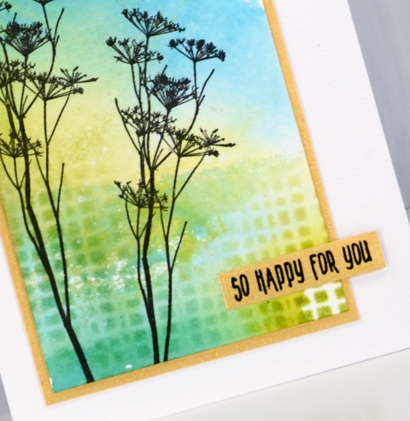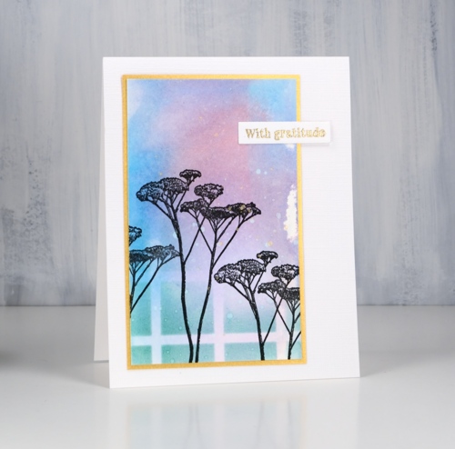 I used the MISTI for stamping because the texture of the watercolour paper makes it necessary to stamp a few times to get a solid image. I used versafine clair nocturne ink which always gives me a crisp print. Once the ink was dry I splattered gold paint from the gansai tambi starry colours palette. The gold splatter might just be my favourite part of these cards; unfortunately it’s not very obvious in the photos.