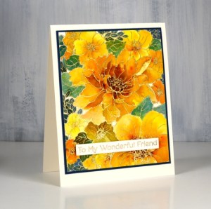 Posted: January 15, 2020 Filed under: Avery Elle, Brusho, fluttering friends, My Favorite Things, Penny Black, Poppy Time, simple sentiments | Tags: Brusho, My Favorite Things, Penny Black creative dies, Penny Black stamps 8 CommentsThis is the last of the three colour panels I did with sandstone, lemon and ost blue brusho. I think this one might be my favourite because of the sky behind the poppy. Of course I was not really responsible for that pretty sky, it was the magic of brusho! I embossed the PB ‘poppy time’ stamp in gold powder on hot pressed watercolour paper first. Next I sprinkled the three colours of brusho on craft mat and spritzed it with water. I didn’t sprinkle too much powder; it is easier to add more colour than to take it away. I swiped the panel through the wet activated brusho and set it flat to dry. I can’t remember if I dabbed colour away or moved some with a paintbrush (I made this card a while ago)