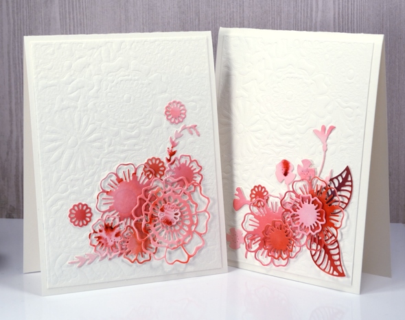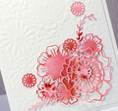 The background below was embossed with the bird flower doily then matted with the same painted paper I die cut the dove from. All the dies I used for these three cards are listed and linked below.