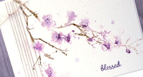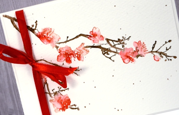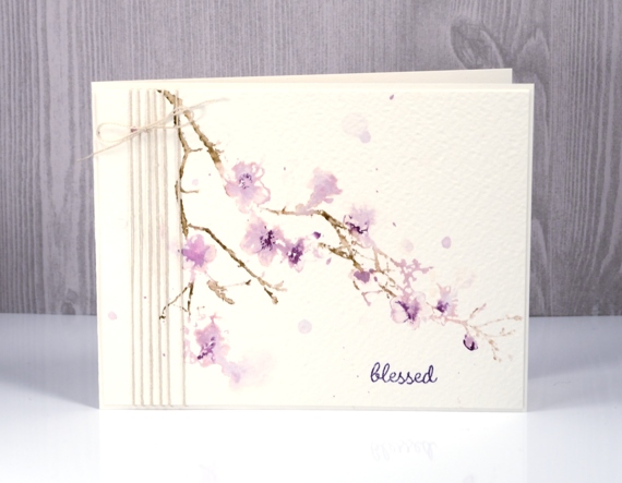 Posted: April 6, 2017 Filed under: CAS, Spring blossoms | Tags: Penny Black stamps, Ranger Distress stains 7 CommentsI’ve been wanting to watercolour this image ever since I stamped it as a black silhouette on an earlier card. The details are fairly small so I kept a light hand with the ink and used a stamp positioner so I could add colour little by little. On a piece of cold pressed watercolour paper I stamped first the blossoms in spun sugar distress stain, then added little dots of festive berries stain and blended with a small watercolour brush. I inked the stems with a gathered twigs distress marker then, after stamping blended on the paper, again with a fine tip brush. I added gathered twigs stain splattered around the blooms.