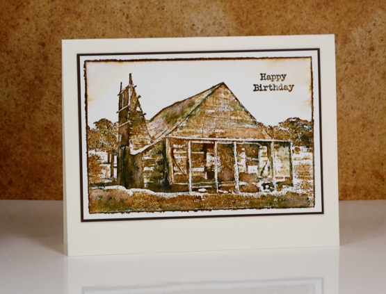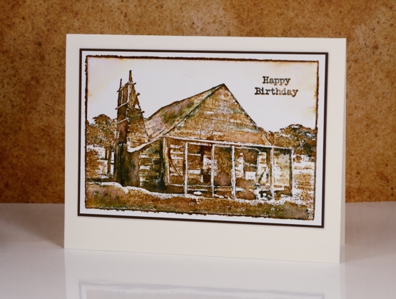 When my dad came to pick me up he browsed some of the stamps on display in the studio. Two in particular caught his eye, the one in his hand above featuring the Norah Head lighthouse that he and I toured the following week and the one on this birthday card. This homestead is representative of older farm buildings that dot the Australian country side. The corrugated iron on the roof is something I rarely see in Canada but common in Australia. I chose to stick to a vintage colour scheme stamping in vintage photo distress ink and black elegant writer pen. I blended parts of the stamped image with water to bring out the shadows.