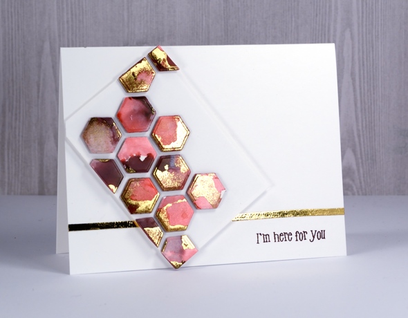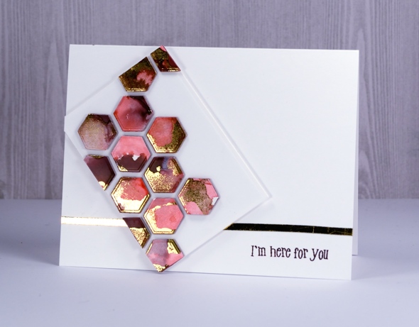 This card looks a little different from my usual. My inspiration came from one of my talented crafty friends, both the technique and the style. She was inspired by one of my online crafty friends. Inspiration abounds and sometimes foiled hexagons are the result.