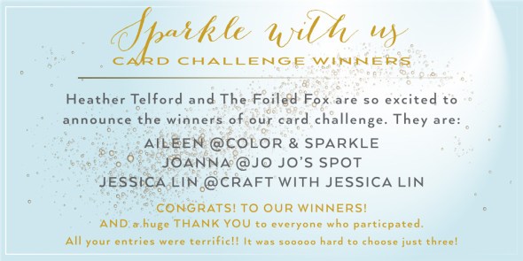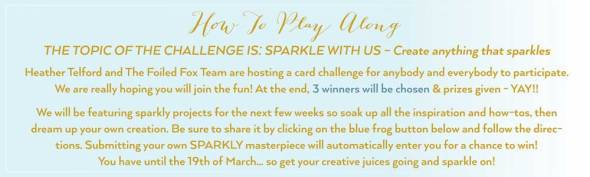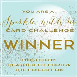 Posted: April 3, 2018 Filed under: Challenges 3 CommentsThank you to everyone who participated in our recent ‘Sparkle With Us’ challenge. I enjoyed seeing a bunch of new ways to add sparkle to my cards. The cards and techniques were wonderful. The Foiled Fox and I are thrilled to announce the winners of our recent challenge. The entries were all so inspiring and sparkly; it was a hard task to narrow it down to three winners. In no particular order here are the stunning cards that totally nailed the challenge each in it’s own sparkly way: