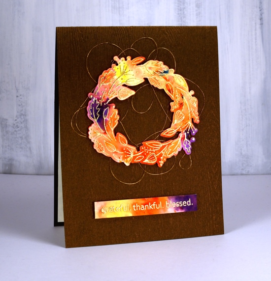 I sprinkled four colours of Ken Oliver’s colorburst powders over the embossing then spritzed with water and watched the colours emerge and spread. I helped them out a little with a paintbrush so paint filled every nook and cranny. Once the panel was dry I die cut the wreath and trimmed the sentiment to the right size then cut a wreath from adhesive backed foam also to pop up the watercoloured one. Before I attached the wreath to the card base I looped some gold embroidery thread back and forth around the wreath letting the adhesive hold it in place.