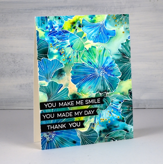 These loosely lined flowers cover a large background stamp, new from My Favorite Things. I chose three colorburst powders and kept the painting loose and funky as well!