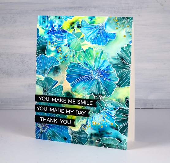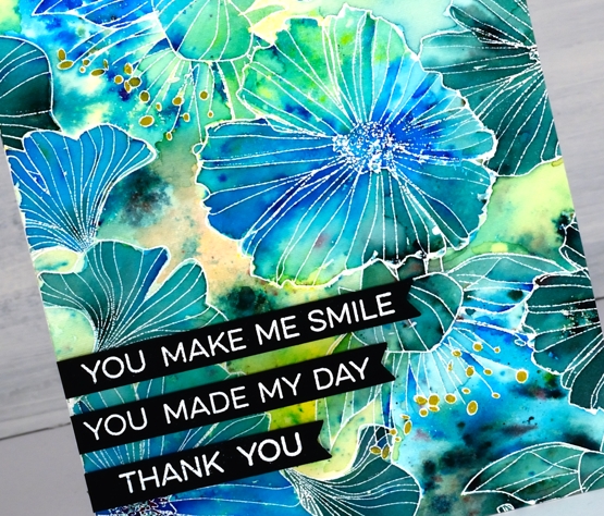 There are some little anthers coming out of a few flowers which I coloured with a gold gel pen. I used three sentiments from another MFT set, ‘all about you’, embossed in white on black then popped them up down the side of my panel. You’ll be seeing more of this pretty stamp; it’s a fun one! Thank you Foiled Fox for sending it my way.