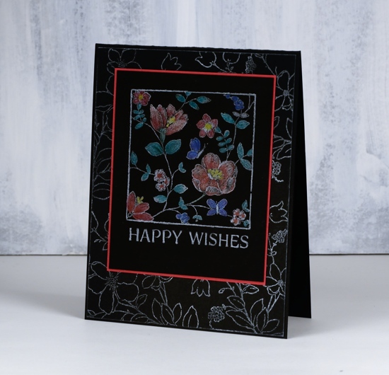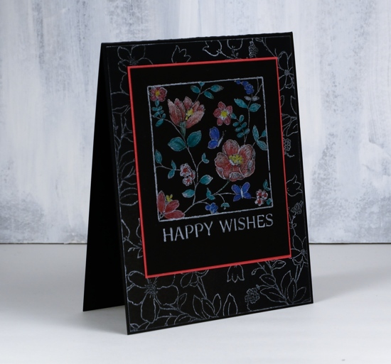 I used a white pencil to lightly colour the flowers and leaves before adding other colours over the top. I also coloured over the border and sentiment with a sharp white pencil to make them pop a little more.