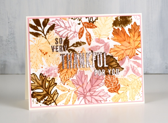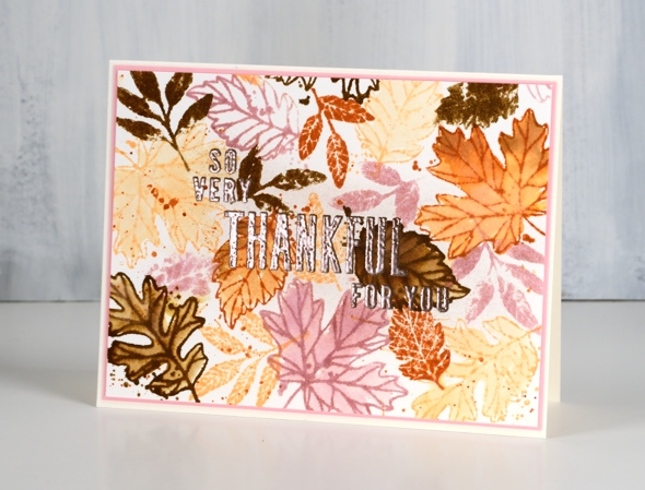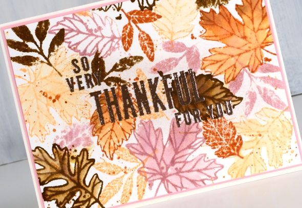 I am thankful for the beauty around me. My blog posts often reflect the natural world I see outside. I love to include flowers, trees and scenery including those crisp snowy scenes I stamp and paint in the colder months. Today’s card is in anticipation of all the colourful leaves I will enjoy in the months to come. They are beginning to turn now but it goes on for weeks and there is quite the range of colours from all the trees in my yard. I don’t generally get pink leaves though, so you are going to have accept some artistic licence on today’s colour choices. This card was created using the Concord & 9th ‘thankful leaves turnabout stamp set’. The set includes a large stamp designed in such a way that you stamp it once on a 6″x6″ panel, rotate it 90°, stamp again and repeat until it has been stamped four times. The end result is a panel filled with leaves but with just enough overlap to look attractive not crowded. If you don’t want a 6″x6″ finished panel you can trim it down or just attach your smaller panel to a 6″x6″ piece of scrap cardstock for stamping and rotate the whole thing.
