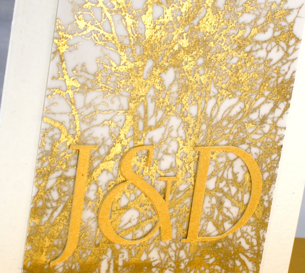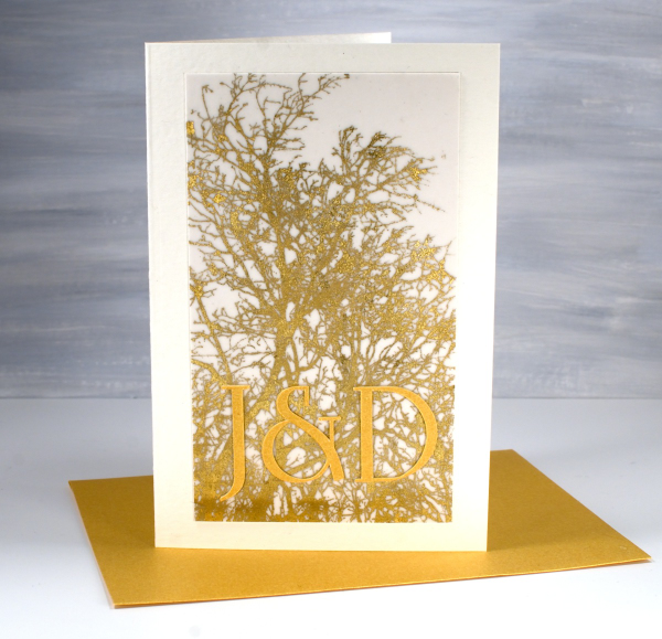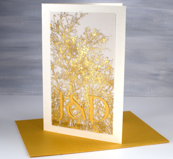 The panel on the card above features the Penny Black stamp ‘skyward‘ stamped on vellum with sticky glue ink and gilded either with foil or gilding flakes( sorry I can’t remember which.) It looked quite magical so I might just have to try and gild a stamped image again to see what happens. I hunted for a font that was similar to the one featured on the wedding stationery then cut initials using the cricut. The font I chose (which is not an exact match) is Linotype Rowena Pro Medium. I had a gold envelope which matched and a pearly silver one for the other card.