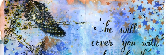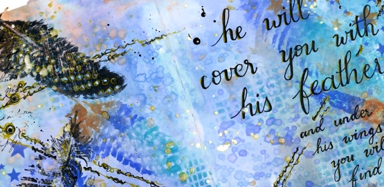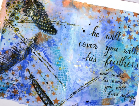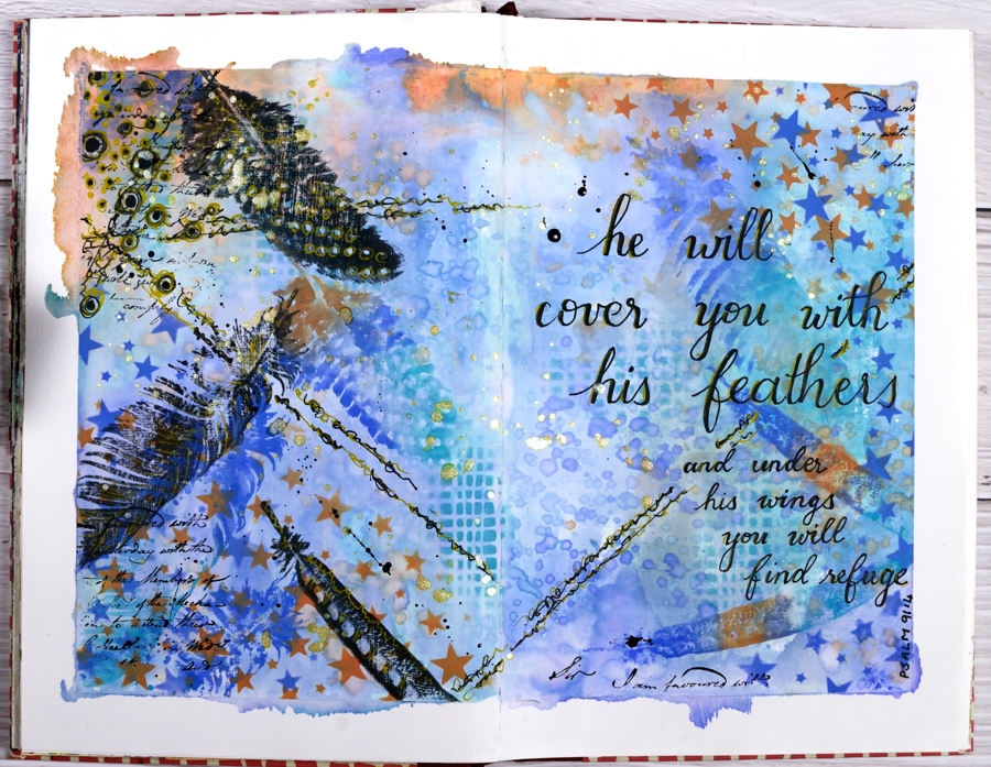 I added visual texture with two stencils from Darkroom Door then stamped feathers from the DD ‘feathers’ stamp set in black and then in the oxide inks. When it came to doodling on the page I used black and gold gel pens and wrote the verse with the same pens. I finished it off with gold and black splatters then removed the tapes to reveal an uneven but quite artistic border.