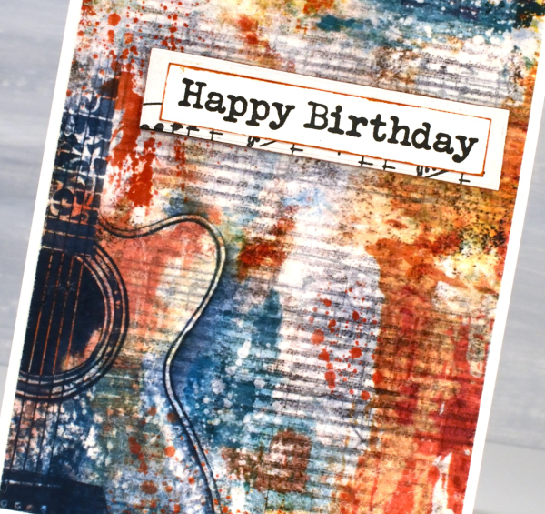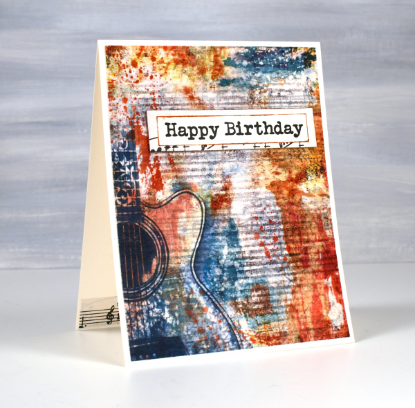 We celebrated my husband’s birthday the same weekend and I paired the CiaoBella blue note cards rice paper panel this time with sheet music, being that my husband is a guitarist. The rice paper already had a tiny music print on it but the music paper I glued behind had a larger staff. I used it inside the card and under the greeting as well.