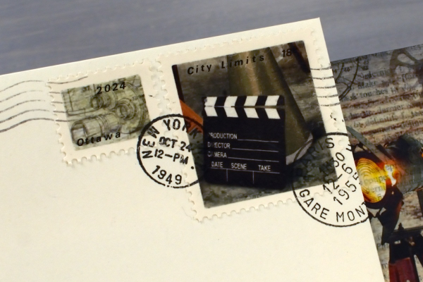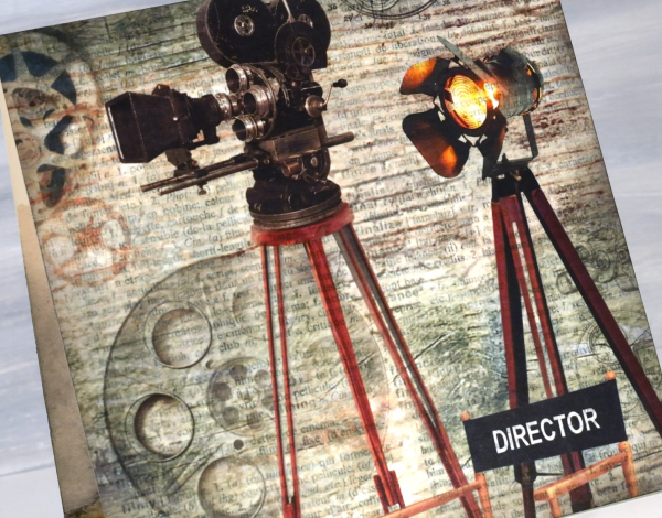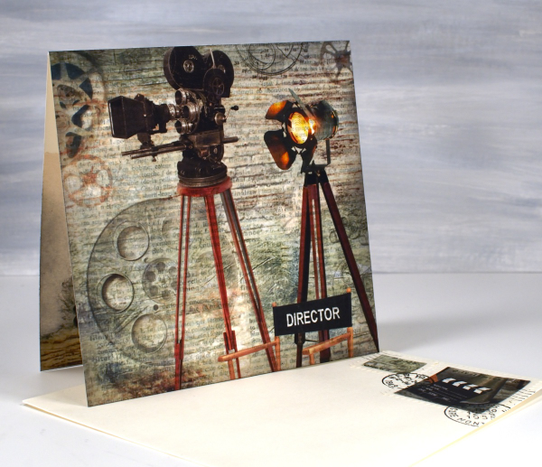 I had a lovely time creating a celebratory card using a sheet of Ciao Bella’s rice paper. I have a little stash of Ciao Bella papers that I hadn’t dipped into and this was definitely the right occasion. The paper is aptly called ‘The director‘. I cut a large section to be the card front, tore a corner featuring film reels to go inside and transformed two small bits into faux stamps for the envelope. I am a little obsessed with faux stamps at present and like to make them realistic with the Darkroom Door global postmarks stamp set.