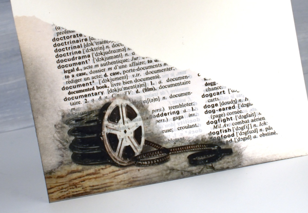 I used a couple of dictionary pages to add to the overall theme. Behind the projector panel is a dictionary page featuring the word ‘film’ and you can see the torn section of the ‘documentary’ page below.