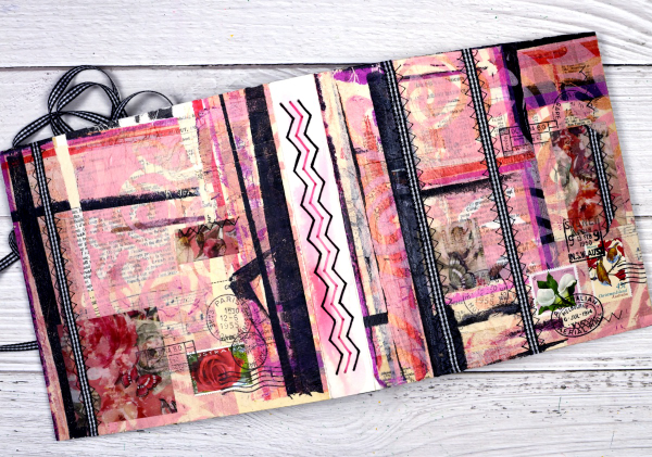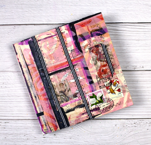 Other than the size of the book and the type of paper in the pages, I followed all the instruction from Ali. She is one of the best teachers I have had the privilege to learn from. I used watercolour paper for my pages and a heavy watercolour paper for the cover. I collaged the cover with vintage papers, then gel printed tissue, fabric washi tape and used postage stamps. The last details added were the gingham ribbon sewn onto the cover with a sewing machine.