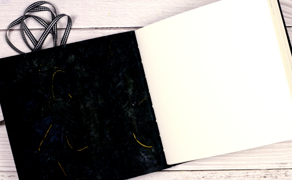 After sewing the ribbon onto the cover there were random lines of stitching on the inside of the cover so I glued black mulberry paper with gold thread in it over the complete inside cover. After I’d taken the photos I decided to add gingham ribbon ties to both the front and back covers to tie the book closed.