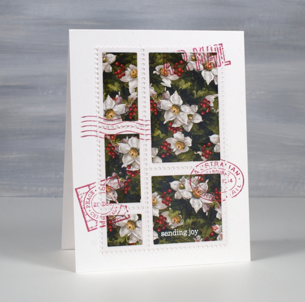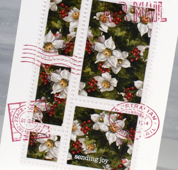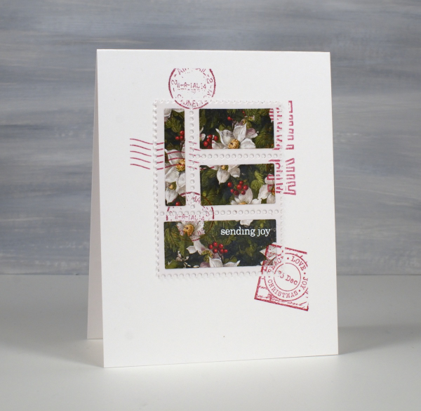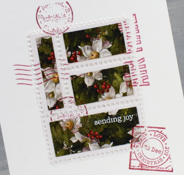 I also used the lovely postage dies from Elizabeth Craft and the Darkroom Door Global Postage and Christmas Inchies stamps to add postmarks along with small sentiment stamps from Penny Black to add words. For the card below I simply cut the word joy using a PB die and added it to a large panel. You could definitely make all these cards with patterned papers or your own painted or printed papers. I just get tempted by the beautiful paper serviettes out there and end up buying them for craft and dinner!