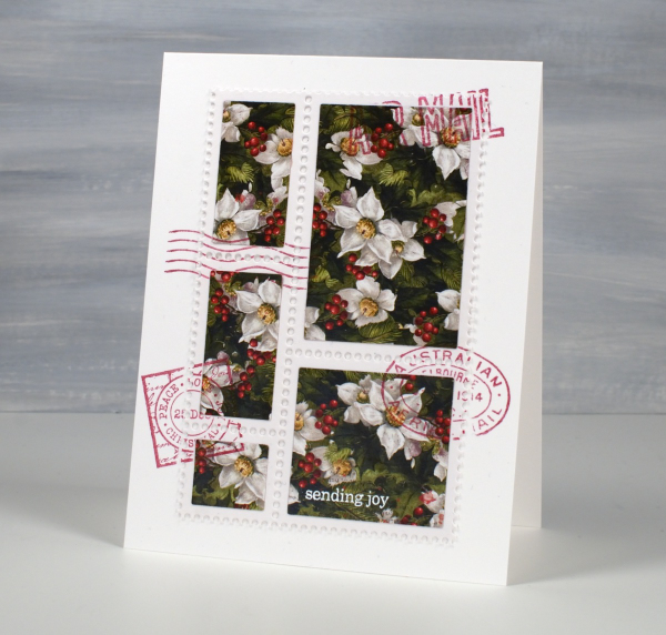 Around this time last year I bought a faux postage die set from Elizabeth Craft Designs. I’ve used it a couple of times with watercolour panels but a friend recently inspired me to try with Christmas papers. I cut a white perforated panel and used the co-ordinating rectangle dies to cut the poinsettia paper.
