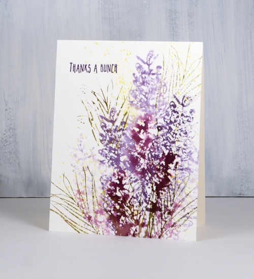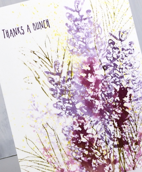 I searched for grevillea images on line and chose a couple of different colour schemes including this purple/burgandy one know as ‘Simply Sarah‘. I used both dusty concord and seedless preserves distress stains to ink the stamp, spritzed, then stamped on hot pressed watercolour paper. I spritzed again without reinking, stamped again and repeated a couple of times to get lighter images. I inked one of the foliage stamps with forest moss distress stain and stamped it a few times in and around the flowers. Finally I splattered some dots of scattered straw stain over the panel and added a sentiment from another new DD set, ‘thank you’. All the thank you sentiments are on one long strip so I masked with some post it notes to leave a space for just one sentiment.