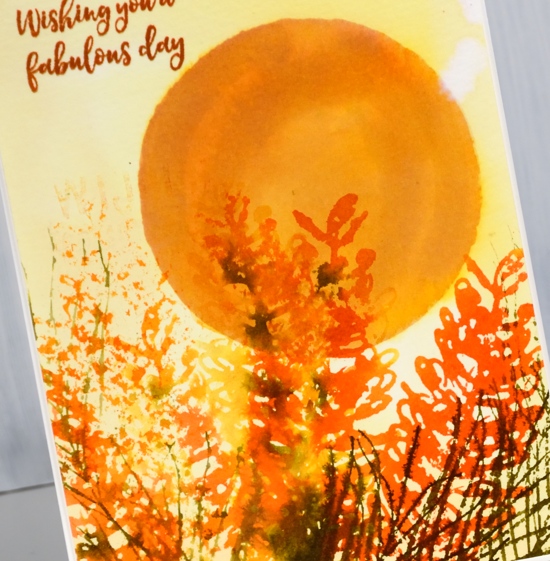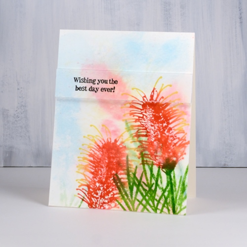 I wanted the foreground images to be sharper so I dried the panel with a heat tool. In order to keep the tips of the grevillea yellow and the rest of the styles red, I stamped first in yellow then in red but I wiped red stain off the ends. I used one of the foliage stamps and inked it with two greens for a more realistic look. I spritzed ever so slightly to make the inks blend a little but not so much as to loose the definition in the detailed stamp.
