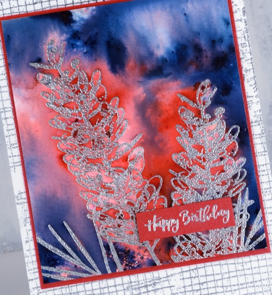 I’m sharing cards over on the Darkroom Door blog today. If you haven’t visited there you should; there is a collection of amazing artists who share their creations there. I have a couple of grevillea cards to share with you today. One of them not too realistic in colour but still bright and bold like the real thing. I stamped the grevillea in versamark twice and the foliage twice then embossed in silver embossing powder on hot pressed watercolour paper. I sprinkled brilliant red brusho around the flower heads and prussian blue brusho round the perimeter of the panel, spritzed with water and let the brusho activate before adding any more. I then played around with adding more water and tilting to make paint move. I also used a brush to pick up wet paint from panel to move it to an empty area then let it dry.