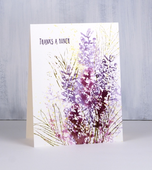 I searched for grevillea images on line and chose a couple of different colour schemes including this purple/burgandy one know as ‘Simply Sarah‘. I used both dusty concord and seedless preserves distress stains to ink the stamp, spritzed, then stamped on hot pressed watercolour paper. I spritzed again without reinking, stamped again and repeated a couple of times to get lighter images. I inked one of the foliage stamps with forest moss distress stain and stamped it a few times in and around the flowers. Finally I splattered some dots of scattered straw stain over the panel and added a sentiment from another new DD set, ‘thank you’. All the thank you sentiments are on one long strip so I masked with some post it notes to leave a space for just one sentiment.